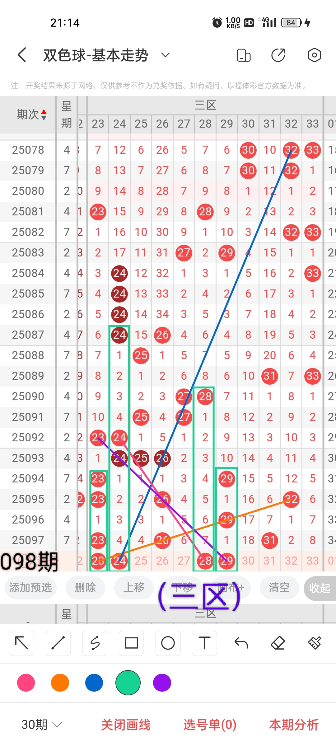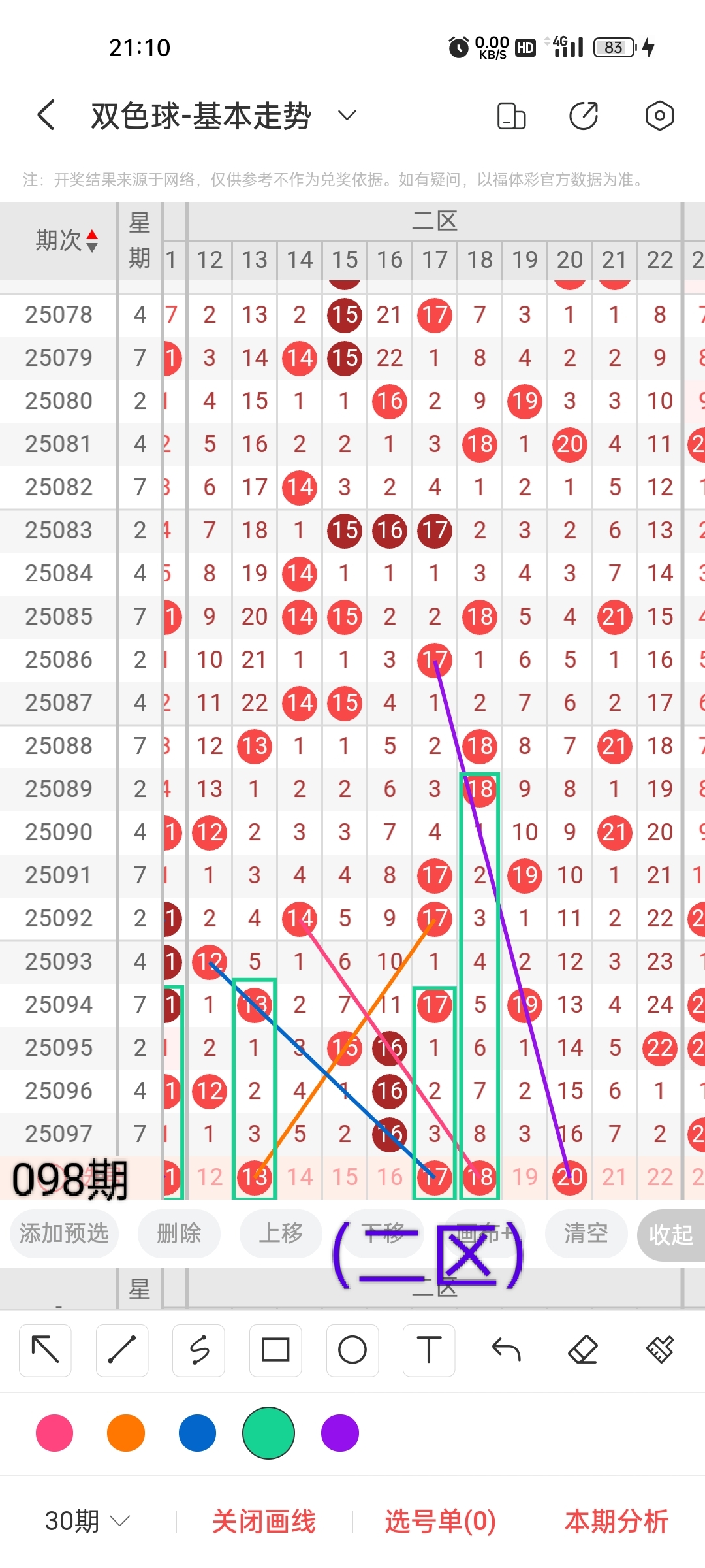 小梁根据图中画线思路,最后给大家汇总提供一下本期红球、蓝球数据,供大家参考: