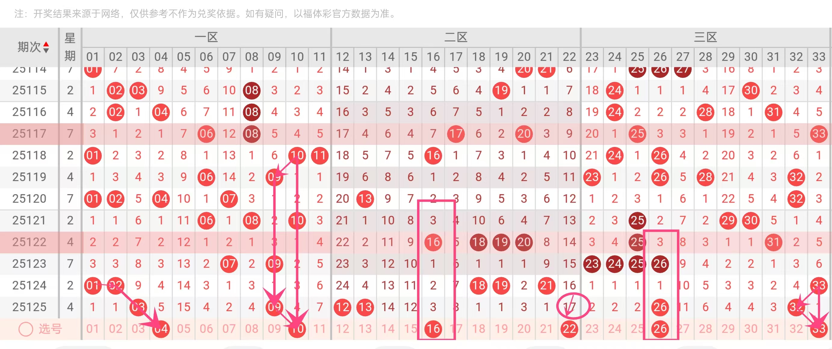 33号:最大号码33显示出明确的启动信号。在经过充分调整后,其回补需求强烈,各项指标均支持其近期开出。与常见的31、32号相比,33号作为冷号回补往往能起到出奇制胜的效果,是优化整体组合的重要变量。该号码在当前后区格局中具有独特的位置优势。