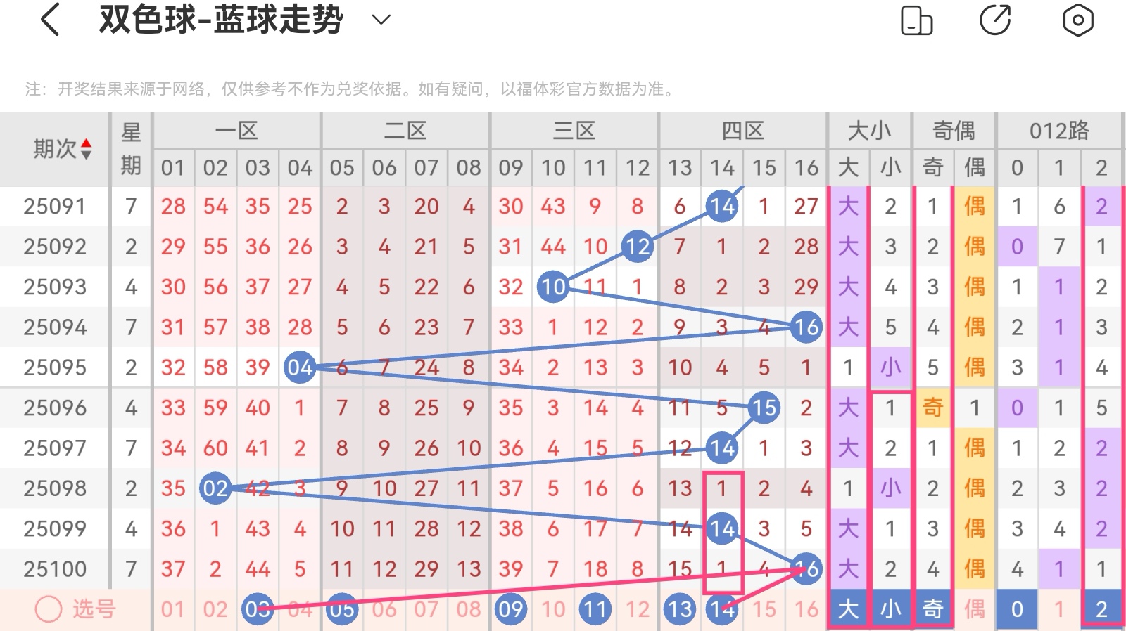 双色球第25101期基本走势分析(上期凤尾正确,三码围蓝正确,杀十红正确)