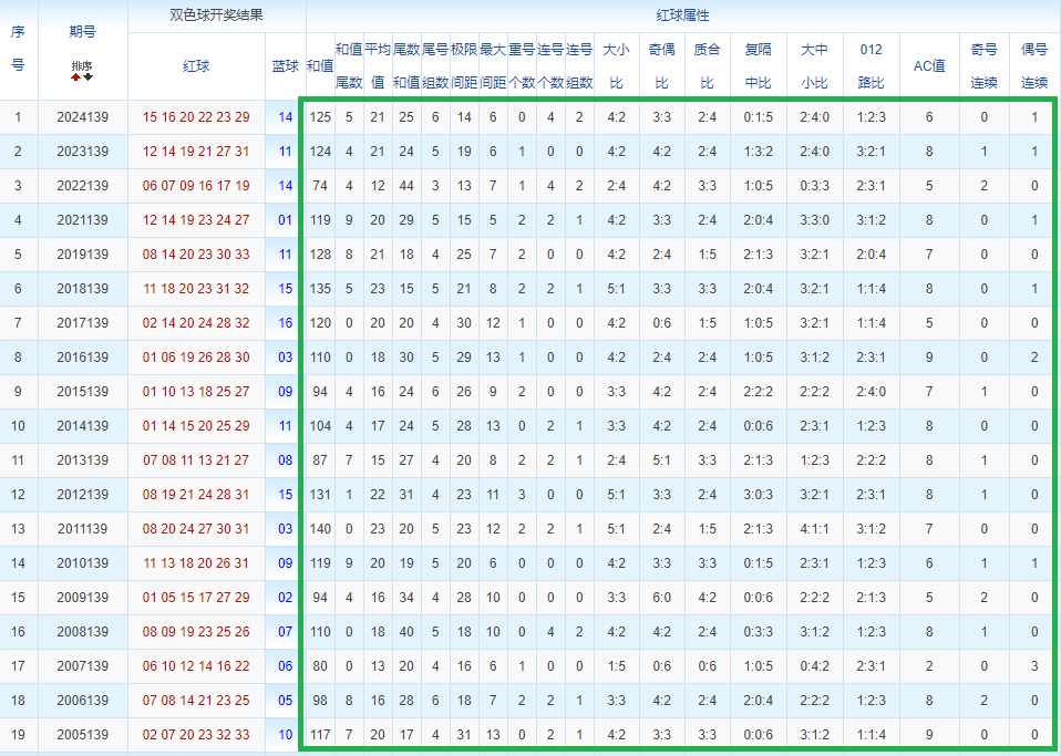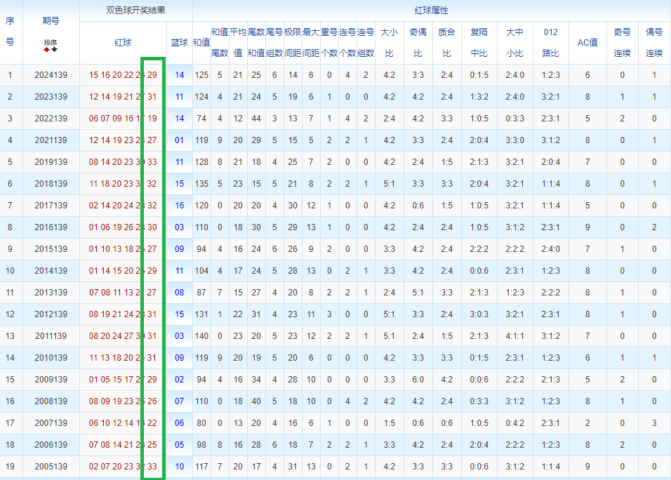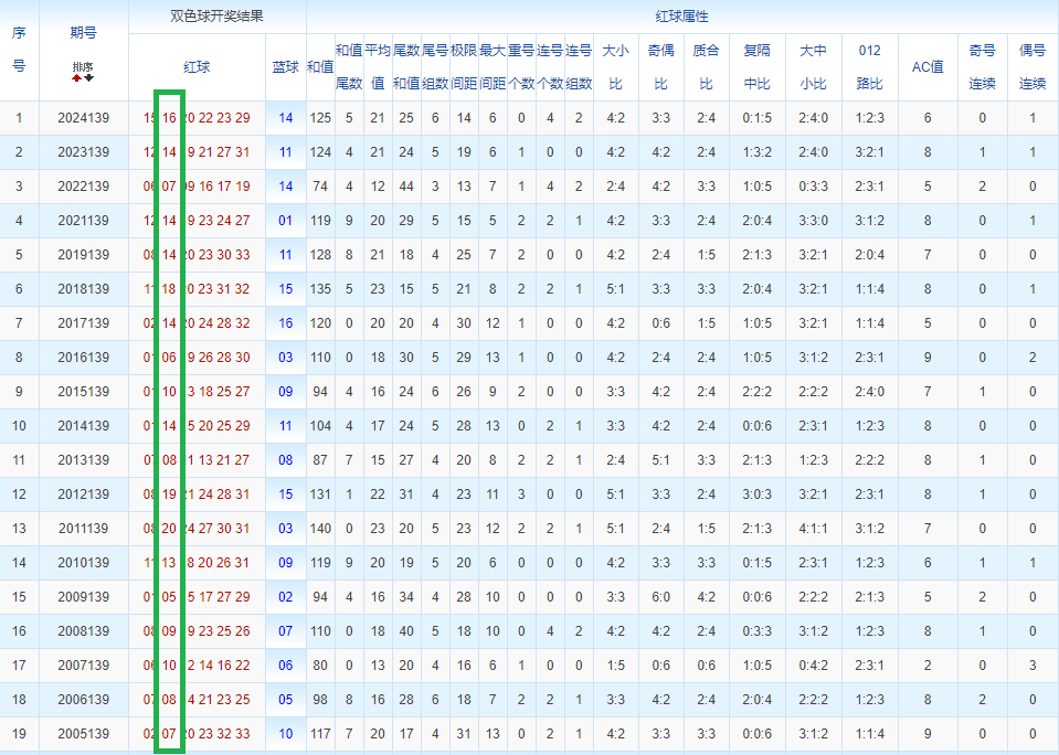 通过观察,我发现双色球往年同期的开奖数据与本期号码之间存在显著关联。具体来说,在红球中,从第一位至第六位,通常会有约4个位置上的数字与往年同期相同位置的号码一致;而蓝球号码中,也有多期开奖结果直接包含了往年同期的数字。因此,我们可以借助往年同期各位置上的号码,作为分析本期开奖情况的重要依据。在此基础上,还可结合往年同期的其他相关条件,进行综合性的号码组合推荐。