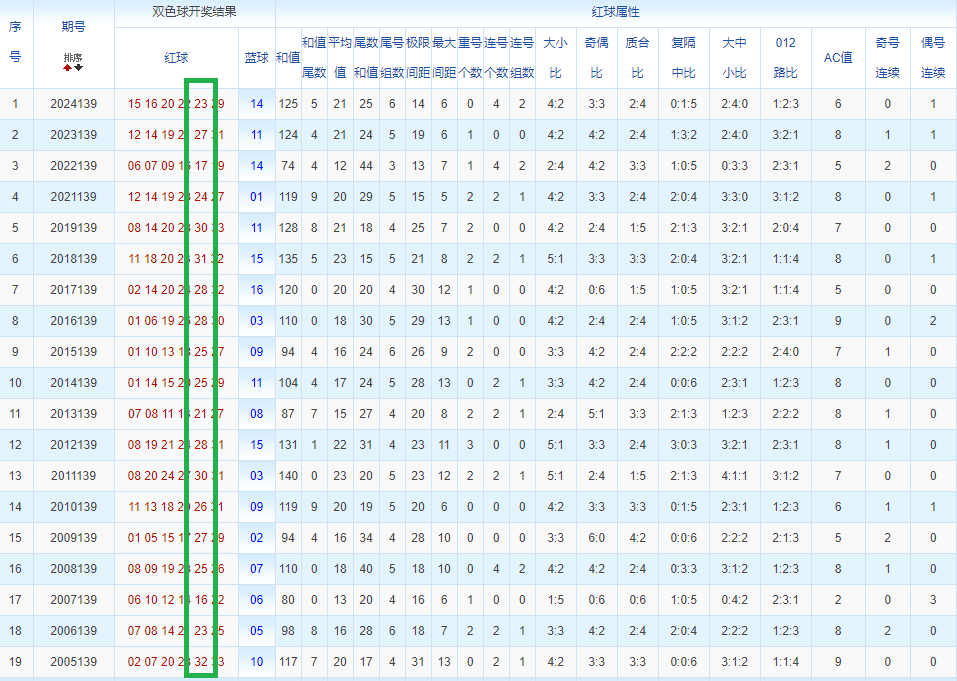 往年同期中选取出现次数靠前的数作为我们的分析对象,其数据有:20 23 14 27 19 08等