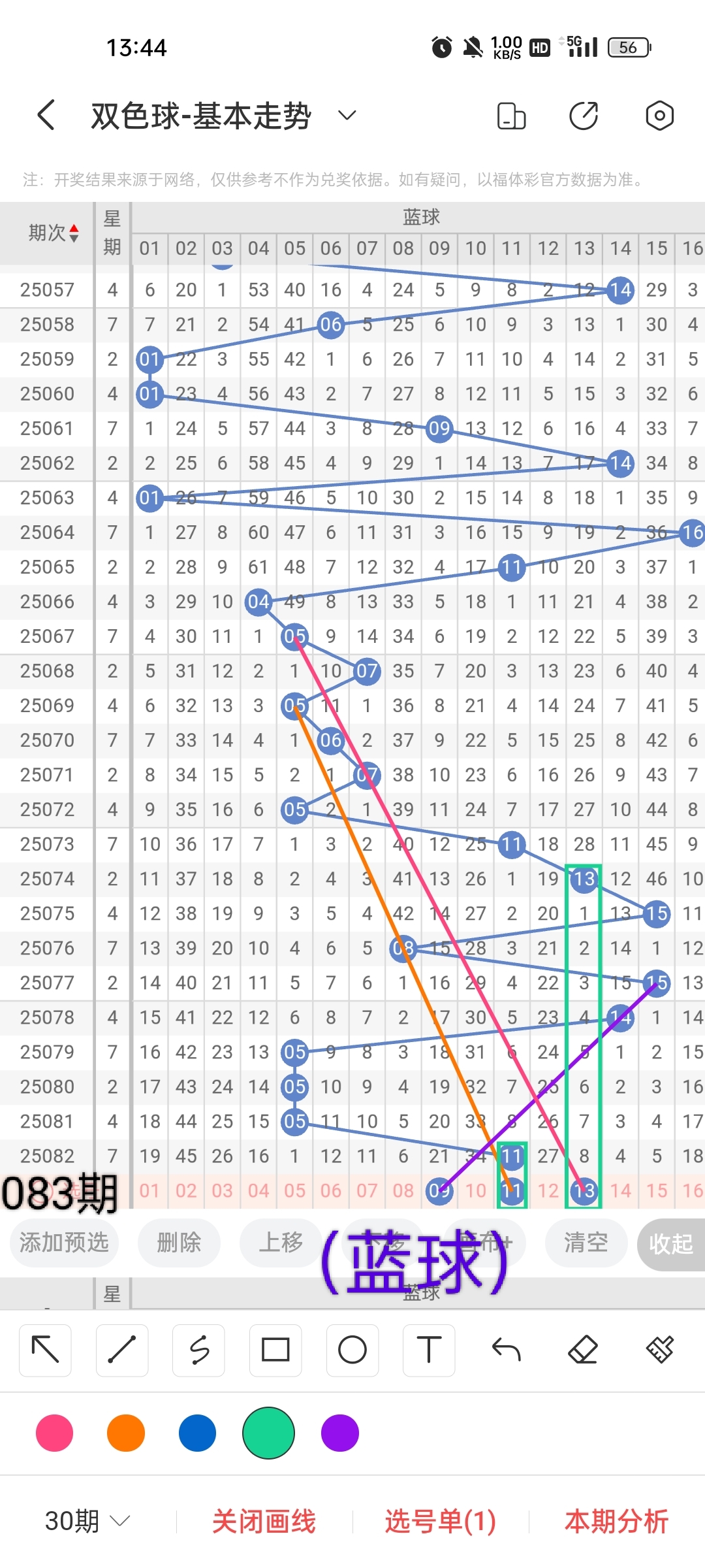 小梁根据图中画线思路,最后给大家汇总提供一下本期红球、蓝球数据,供大家参考: