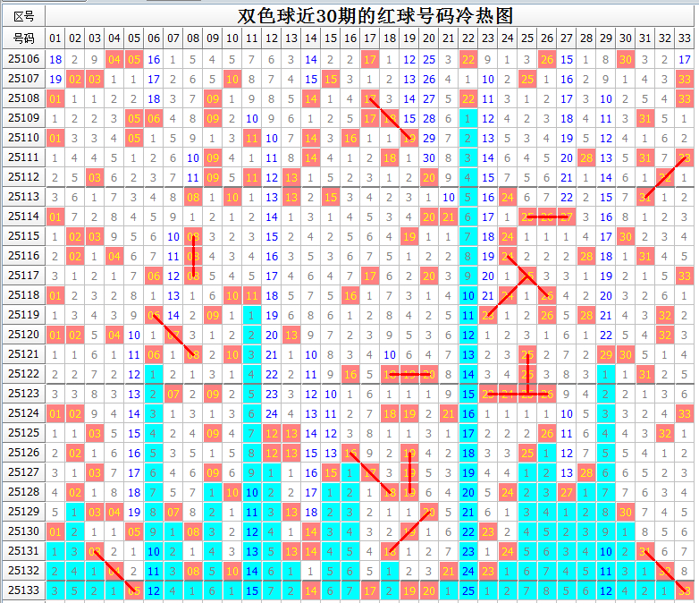 双色球近30期的红球号码冷热图 (数字为遗漏期数,蓝色标记的为遗漏超过10期的大冷号)