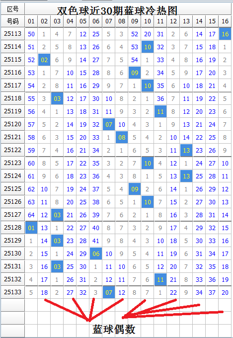蓝球本期有热蓝8枚,冷蓝8枚,蓝球冷码数量一样。上期开出冷蓝,由于近期蓝球冷热交替开出规律不明显,本期蓝球冷热难定。