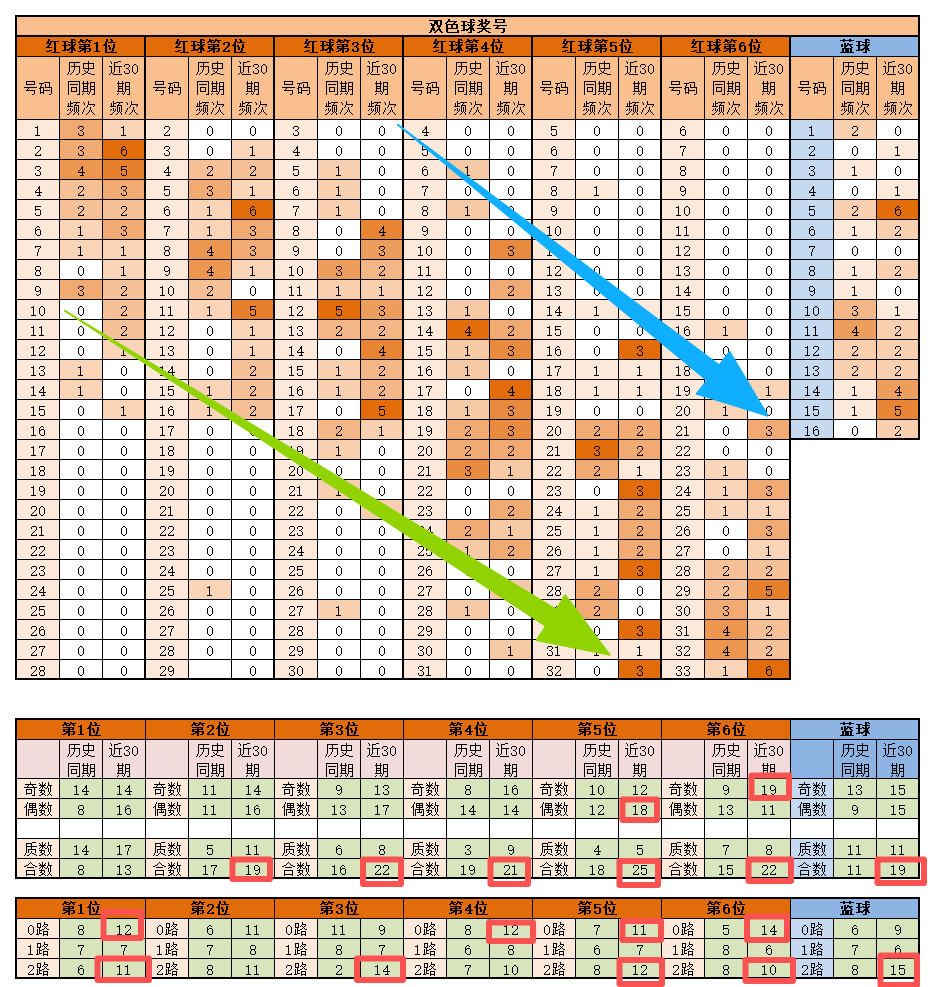 第6位,基本在21-33之间,历史同期频次最多的为31-32近30期,频次最多的为33明显特征是奇数合数和02路优势;推荐重点24-26-29-33。