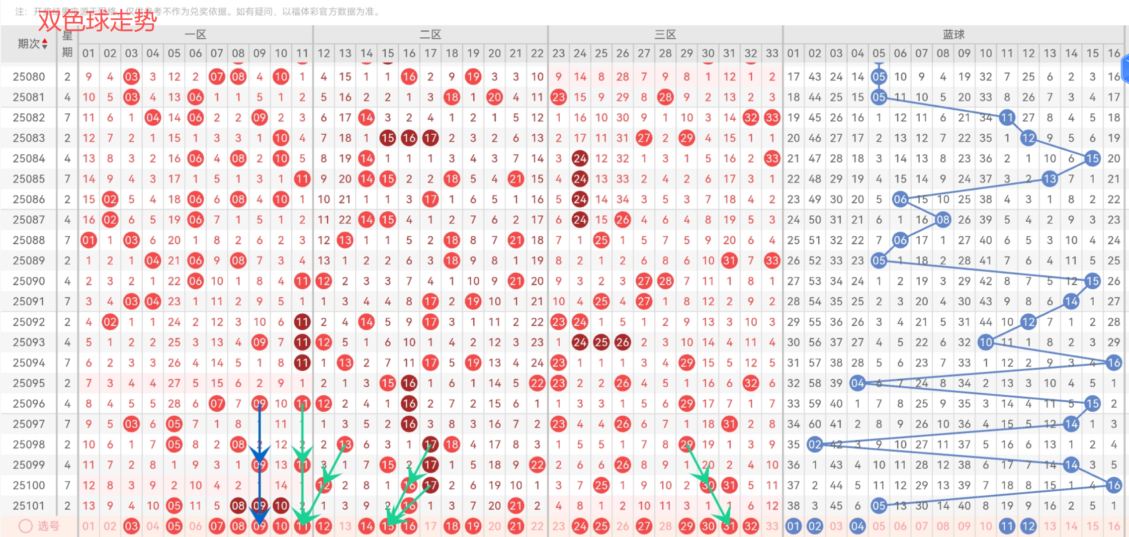 蓝球区,上期提到重点考虑二三区,思路是正确的,本期首先从冷热号分析,最近第99期出了一个热码,本期出热号的机会....(留给会员文章吧);