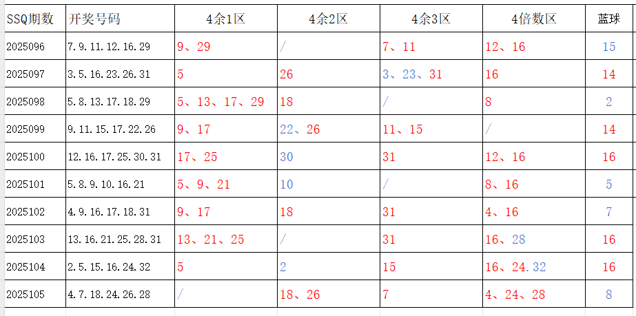 首先看上期回顾,双色球2025105期开奖结果:4.7.18.24.26.28+8。其中红球号码开出:4余1区号码0个,4余2区号码2个,4余3区号码1个,4倍数区号码3个。蓝球号码:冷号重开。再看上期个人分析:胆尾中出2尾3码!凤尾号码中!恭喜中出的虹友!