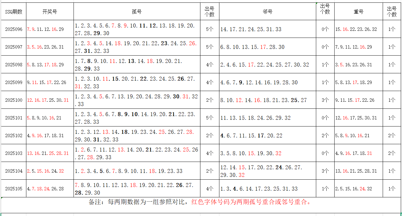 如图,以近两期数据为一组,进行对比分析。相同的孤号、邻号,可能在下期出1-4个左右。上期孤号开出4个,邻号开出1个,重号1个。本期参考孤号:1.2.9.10.11.12.13.14.15.16.20.21.22.30.31.32.33;邻号:3.5.6.8.17.19.23.25.27.29;孤、邻号重合号码精选:***(会员专区可见)。个人分析,仅供参考。