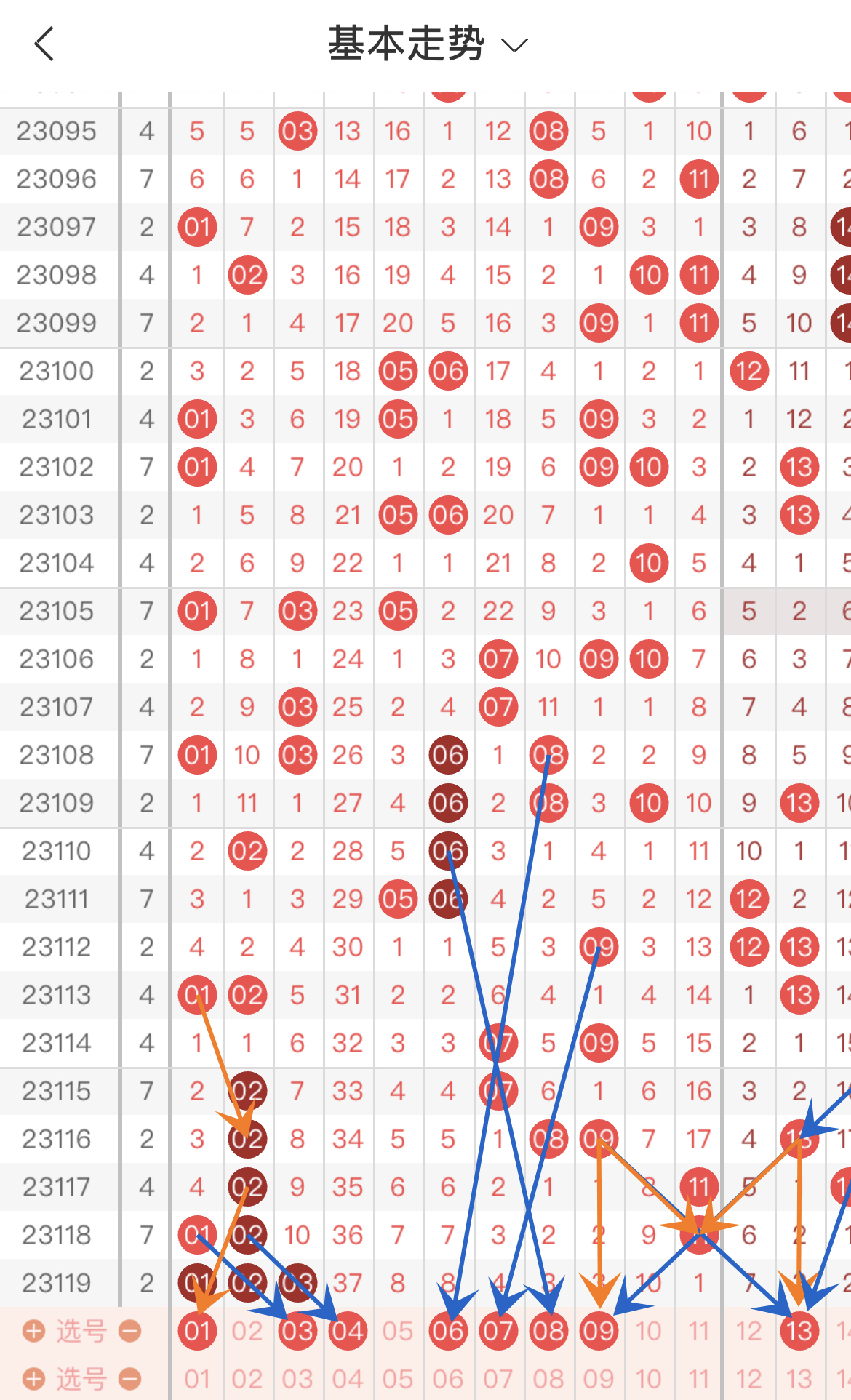 在具体号码方面,如图1, 一区共7枚走势号码:01-03-04-06-07-08-09。符合传号走势的号码(蓝色箭头)有:03-04-06-07-08-09;符合对称走势的号码(橙色箭头)有:01-09;符合间隔走势(绿色方框)的号码:无。综合来看,一区强走势号码为:09;弱走势号码为:01-03-04-06-07-08。