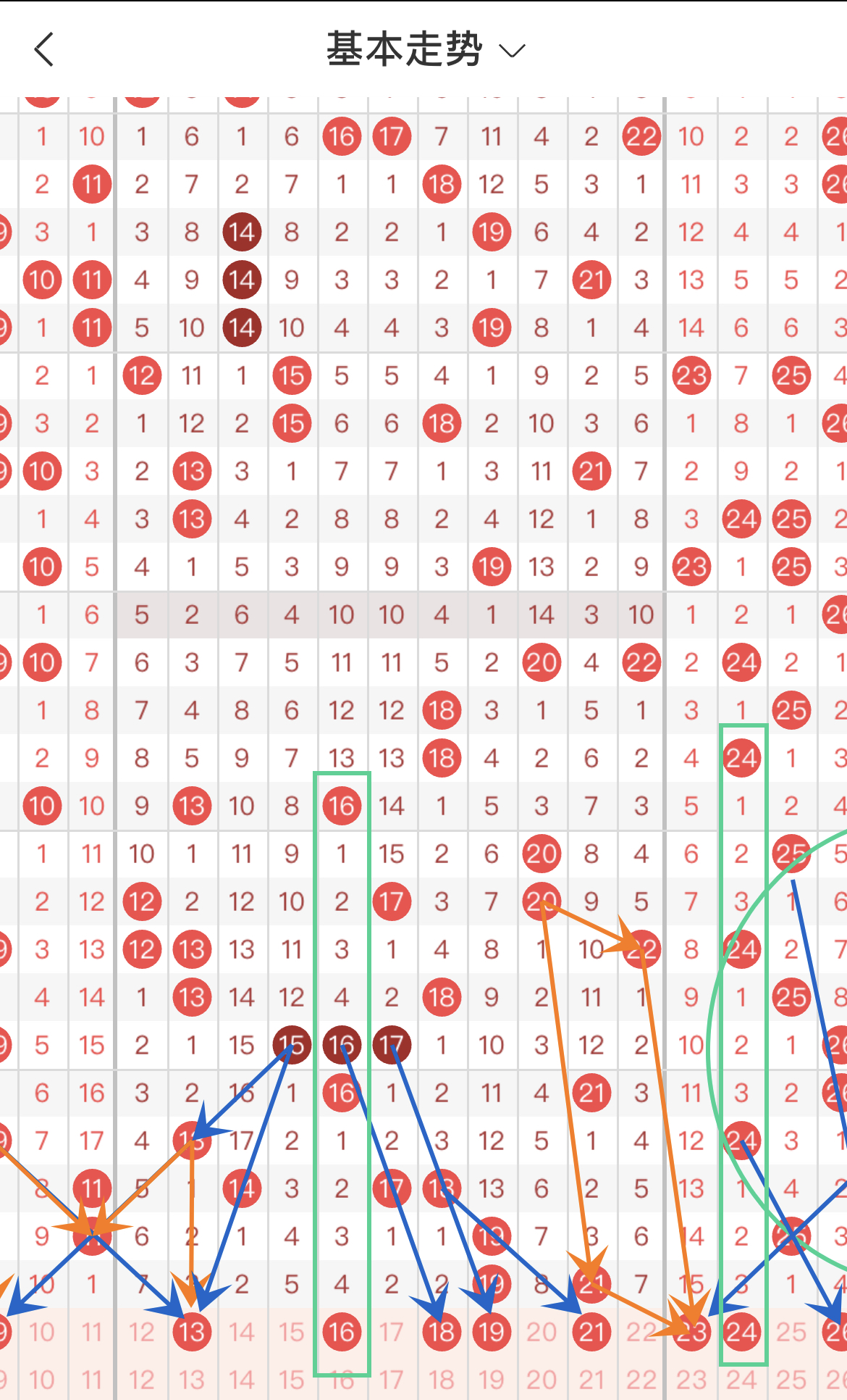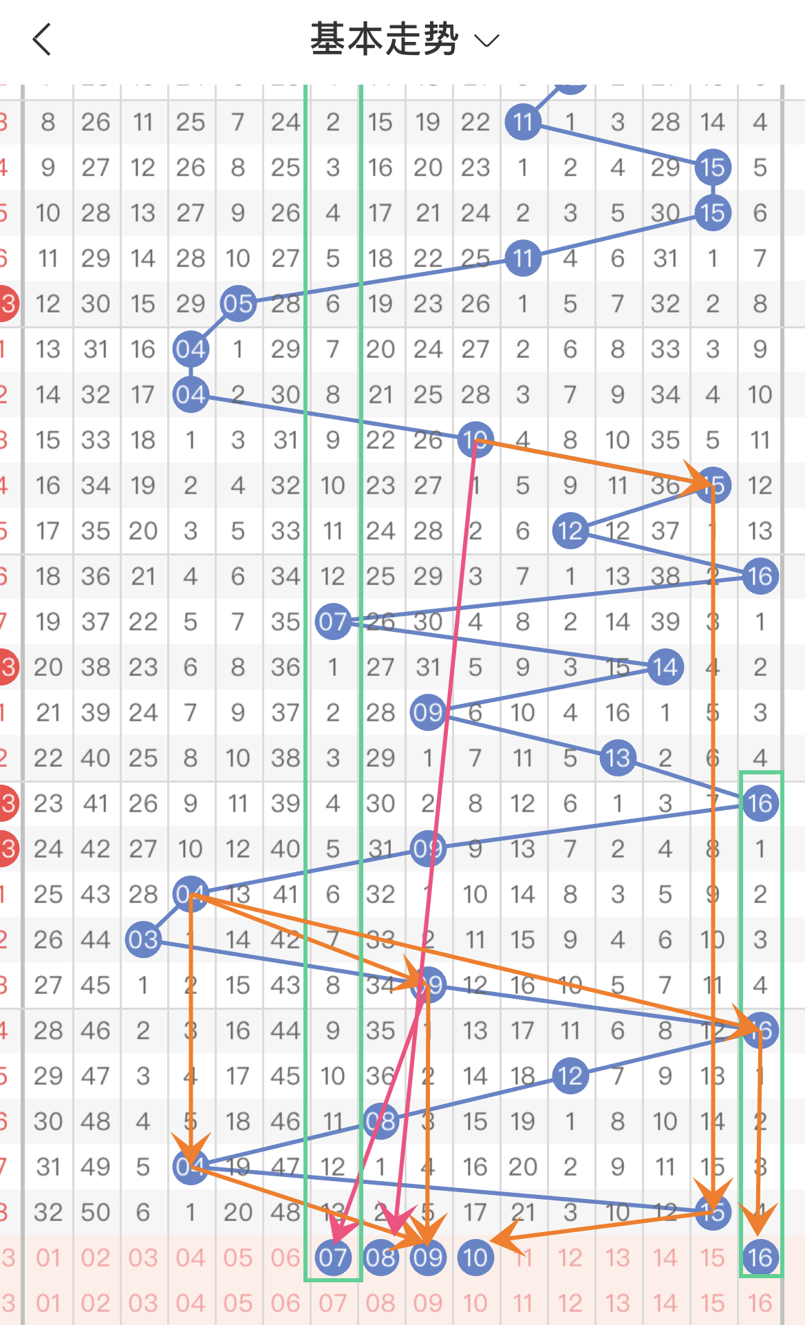 如图4,图形走势蓝球共5枚:07-08-09-10-16。其中,符合传号走势的号码(红色箭头)有:07-08;符合对称走势的号码(橙色箭头)有:09-10-16;符合间隔走势(绿色方框)的号码有:07-16。除图形走势蓝外,本期演算规律蓝还包括:(1)17杀蓝:02;(2)折返:04-08-12-16;(3)重蓝:15;(4)红落蓝:01-02-03;(5)和整数:01-05-06-11-15-16;(6)边窜:14-16。综合来看,非走势蓝仅一枚:13,图形强走势蓝:07-16,演算规律强走势蓝:01-02-15-16。后区蓝16为本期最强走势蓝球,满足2种图形走势和3种演算规律。