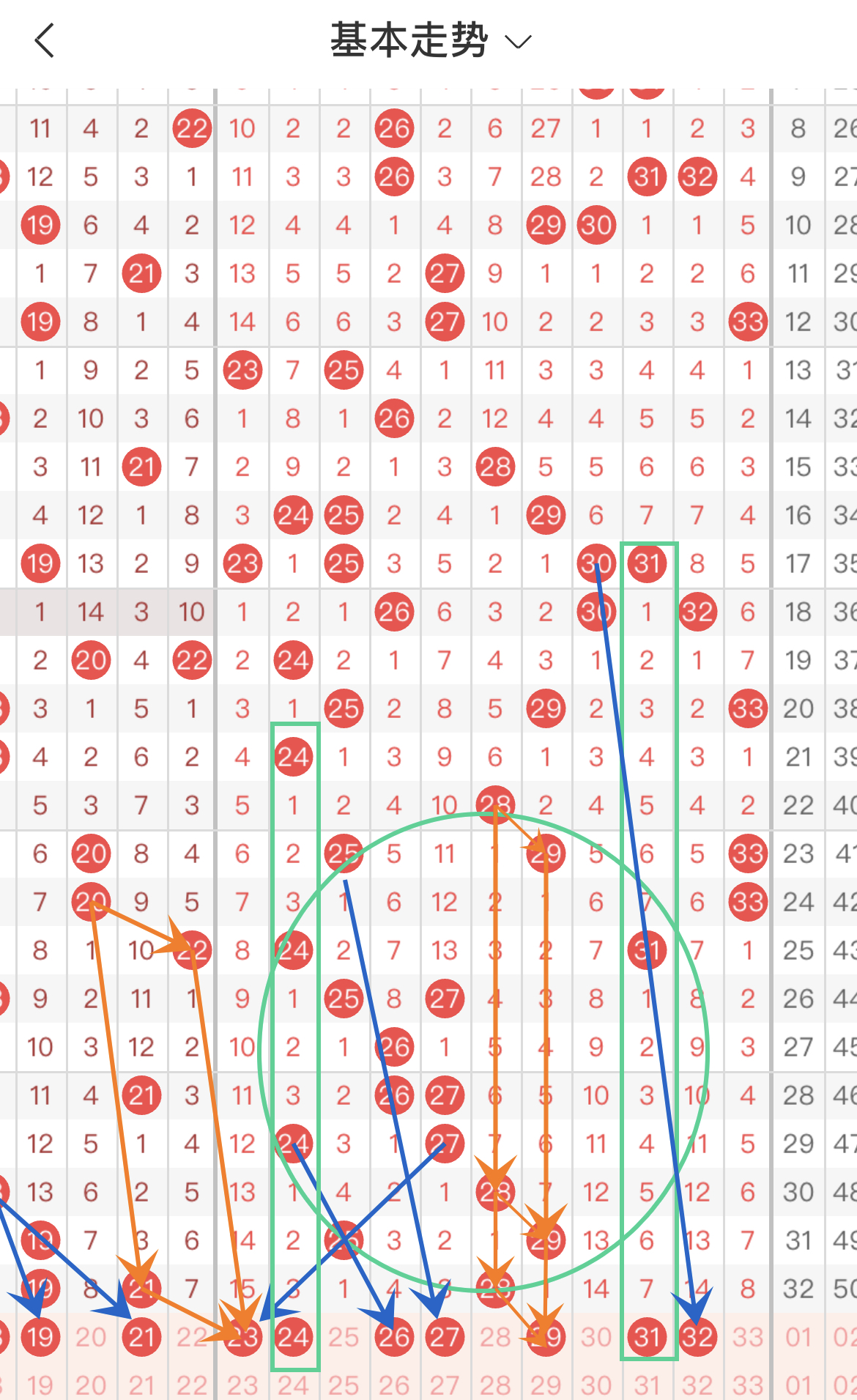 回到具体号码,三区共7枚走势号码:23-24-26-27-29-31-31。符合传号走势的号码(蓝色箭头)有:23-26-27-32;符合对称走势的号码(橙色箭头)有:23-29;符合间隔走势(绿色方框)的号码有:24-31。综合来看,三区强走势号码为:23-24-31;弱走势号码为:26-27-29-32。