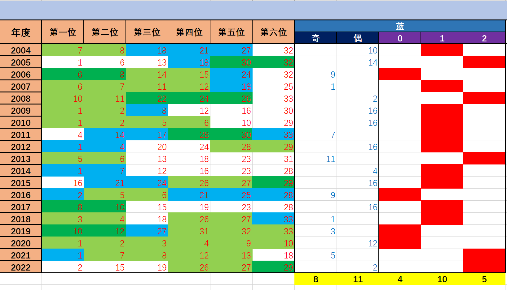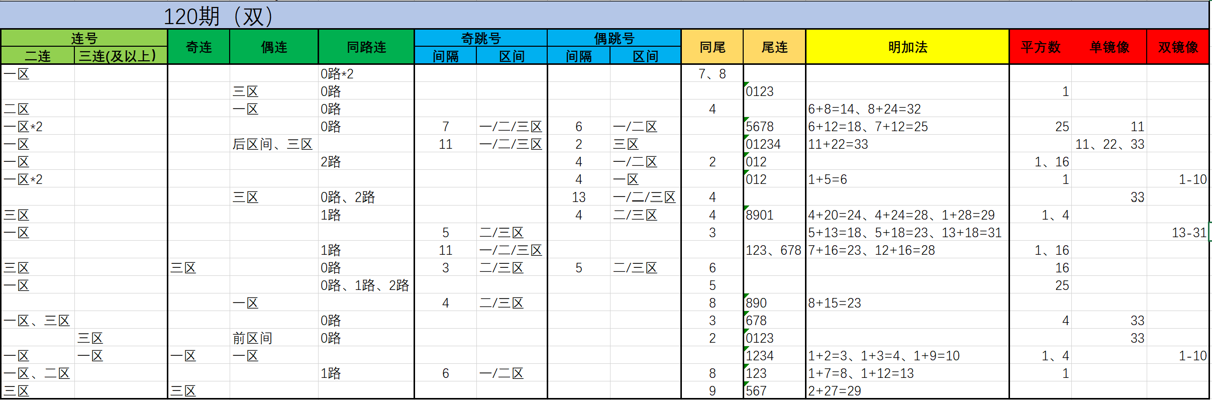 如图5,我用浅绿色底纹标注了连号,深绿色底纹标注了奇连/偶连,天蓝色底纹标注了同路连。由图可见,红球方面,双色球120期明显属于连码周期,连码属性的号码占据3/4的版图。同时,跳号在本期也极其活跃,需要着重防范。因此本期必须关注连码的表现,建议着重关注2-3种连码齐开,着重关注2组连码,防范3-4组连码。蓝球方面,偶数蓝占据主导,接下来进入同期具体分析。