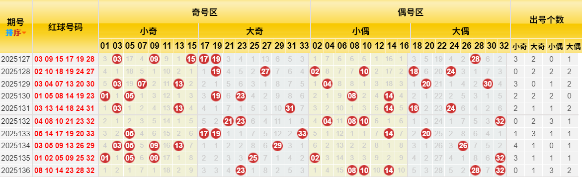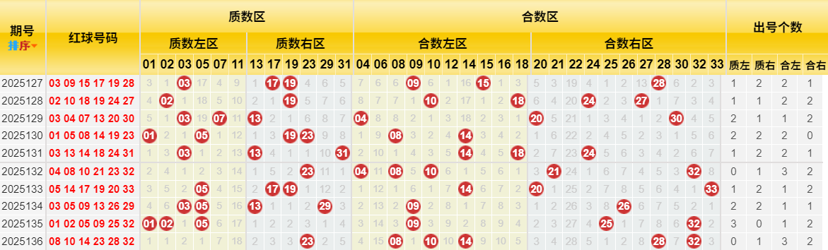 上期红球质合比为1:5,合数热度达到顶峰。近10期质合比为17:43,合数长期过热。物极必反,本期质数号码回补信号强烈,预测质合比将转向 3:3。