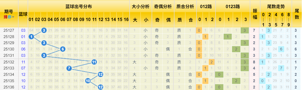 近5期蓝球号码为07 -> 11 -> 03 -> 10 -> 12,在03-12区间内宽幅震荡。上期开出大号12,结合2路号码的冷态,本期应重点关注中小区的2路号码,如05、08、11。