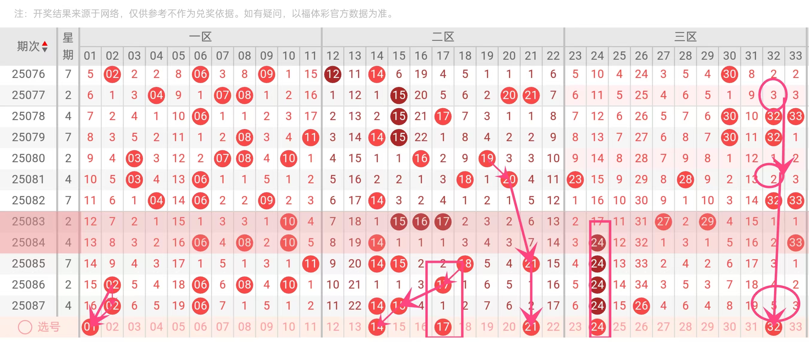 二区(12-22)占3码,一区(01-11)仅1码,三区(23-33)2码。虽一区略弱,但整体分散性强,规避了同区过热。