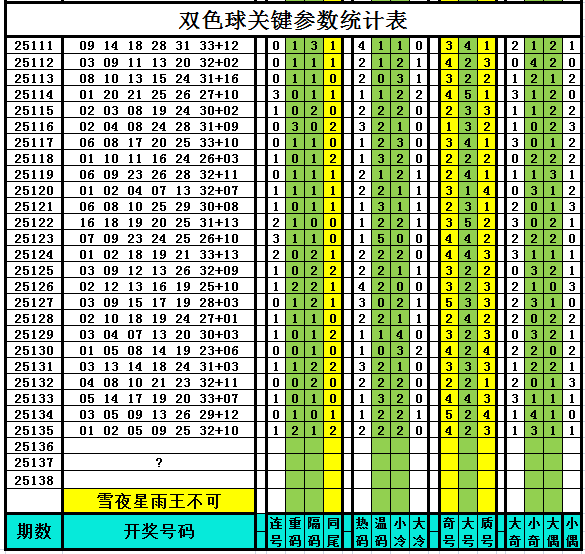 以下是作者手工统计的双色球关键参数统计表,对喜欢参数分析、过滤缩水、选号胆杀的技术性双色球爱好者有所帮助,其它读者可略过不看。