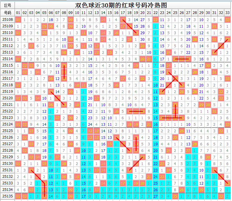 双色球136期冷热号码及出号趋势分析(具体号码可参见上图或会员文章的觅宝图):