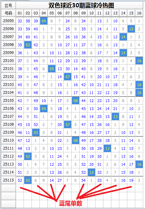 蓝球本期有热蓝9枚,冷蓝7枚,蓝球热码数量稍多。上期开出热蓝,由于近期蓝球冷热交替开出规律不明显,本期蓝球冷热难定。
