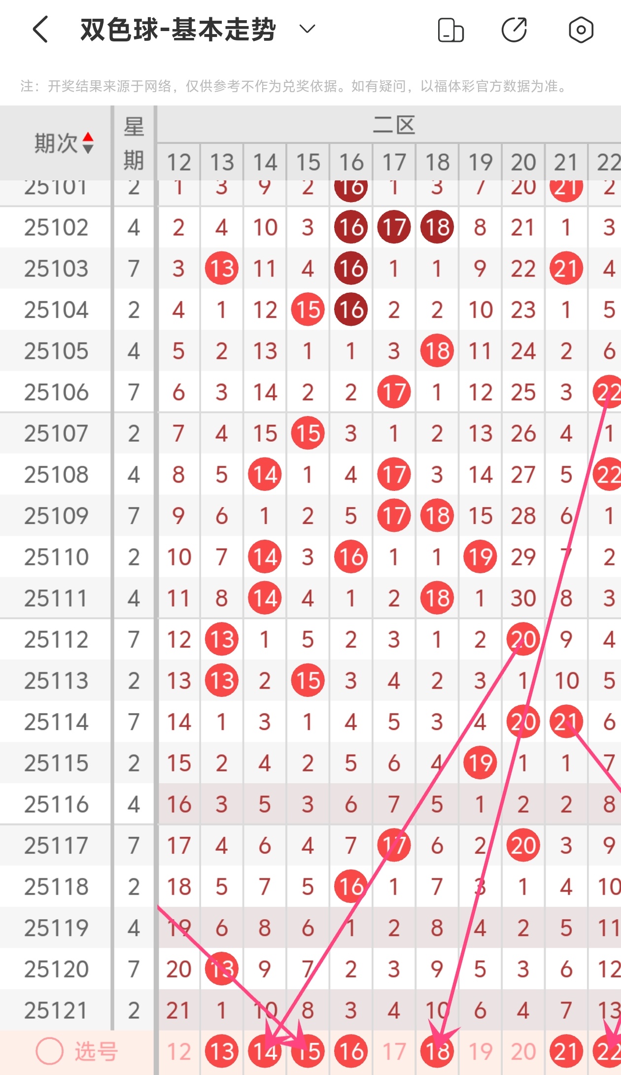 上期第二区间走空,本期我们可以从上面走势图中看到选号的思路,14为斜连走势,15为斜连走势,18为斜连走势,22为斜连走势,综合以上分析本期第二区间推荐13 14 15 16 18 21 22
