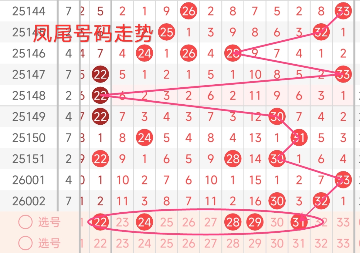 上期凤尾号码为32,振幅下降了1点,开出了偶数号码。回顾近期凤尾号码,振幅波动较大。上期凤尾号码为32,开出偶数号码。观察凤尾号码的走势,凤尾号码在红三区之间较为常见。上期凤尾是 32,处于较高位置。近期凤尾号码在 22 - 33 之间徘徊。预计本期凤尾可能会有所下降,考虑到整体号码分布的平衡以及跨度缩小的预测,凤尾号码不会像上期那么高,预计本期凤尾号码可以注意22 - 31区间开出。这些号码在历史开奖中出现频率较高,且符合当前的走势规律。本期还需注意一些连续漏出的冷码有望在本期热出。本期凤尾号码可重点关注22、24、28、29、31。
