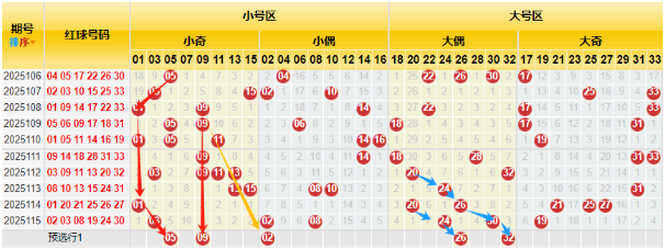 1、小大奇偶交叉图(小奇数红色箭标、小偶数黄色箭标、大偶数蓝色箭标、大奇数绿色箭标)
