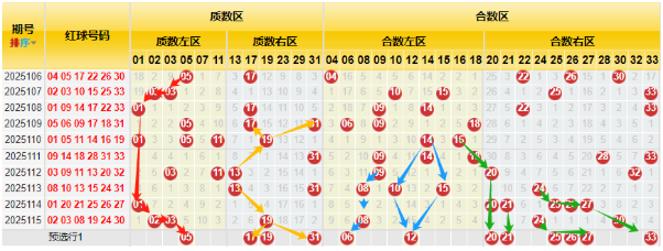 【数据参数】 根据前区质合小大属性,组合成上图质数区1、2、3、5、7、11、13、17、19、23、29、31和合数区4、6、8、9、10、12、14、15、16、18、20、21、22、24、25、26、27、28、30、32、33,质数区分为质数左区1、2、3、5、7、11和质数右区13、17、19、23、29、31;合数区分为合数左区4、6、8、9、10、12、14、15、16、18)和合数右区20、21、22、24、25、26、27、28、30、32、33。