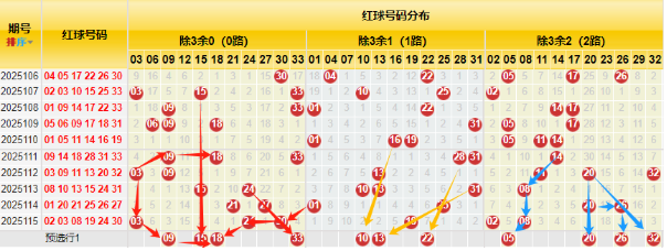 【数据参数】 根据前区除3余数,组合成上图分别为余0路(简称0路)3、6、9、12、15、18、21、24、27、30、33;余1路(简称1路)1、4、7、10、13、16、19、22、25、28、31; 余2路(简称2路)2、5、8、11、14、17、20、23、26、29、32。