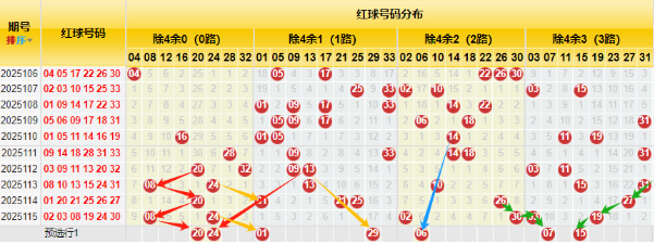 【数据参数】根据前区除4余数,组合成上图分别为余0路(简称0路)4、8、12、16、20、24、28、32);余1路(简称1路)1、5、9、13、17、21、25、29、33;余2路(简称2路)2、6、10、14、18、22、26、30;余3路(简称3路)3、7、11、15、19、23、27、31。