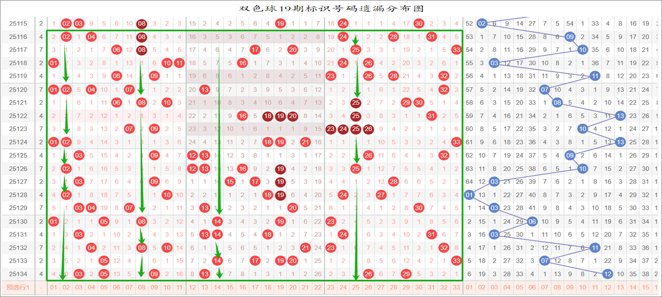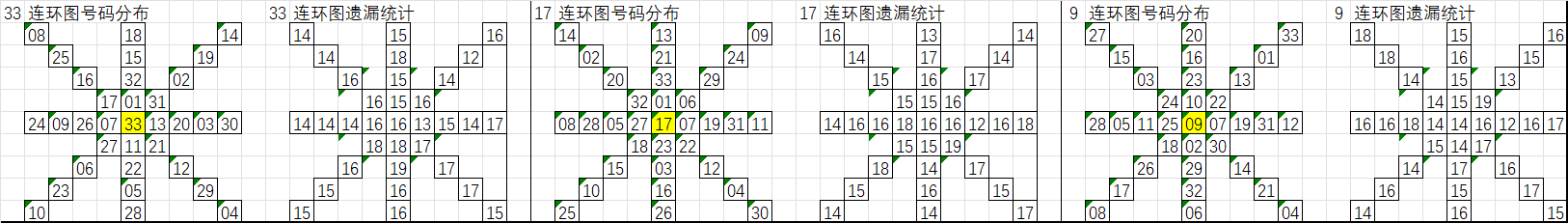 由于数据量大,不一一统计,下图为各个号码分别在33、17、9连环图上的遗漏统计汇总图: