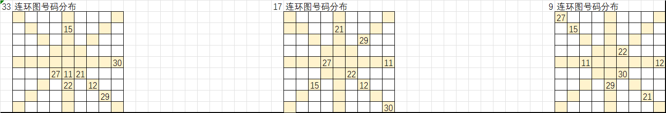 以上是遗漏大于16的号码分别在33、17、9连环图的分布,按照九转连环图选号规律,选取这些号码“环上”和“轴上”的相邻号码作为胆码,把这些胆码进行次数统计即可形成我们组号的排序,从出次多到少进行取号得出我们的大底。