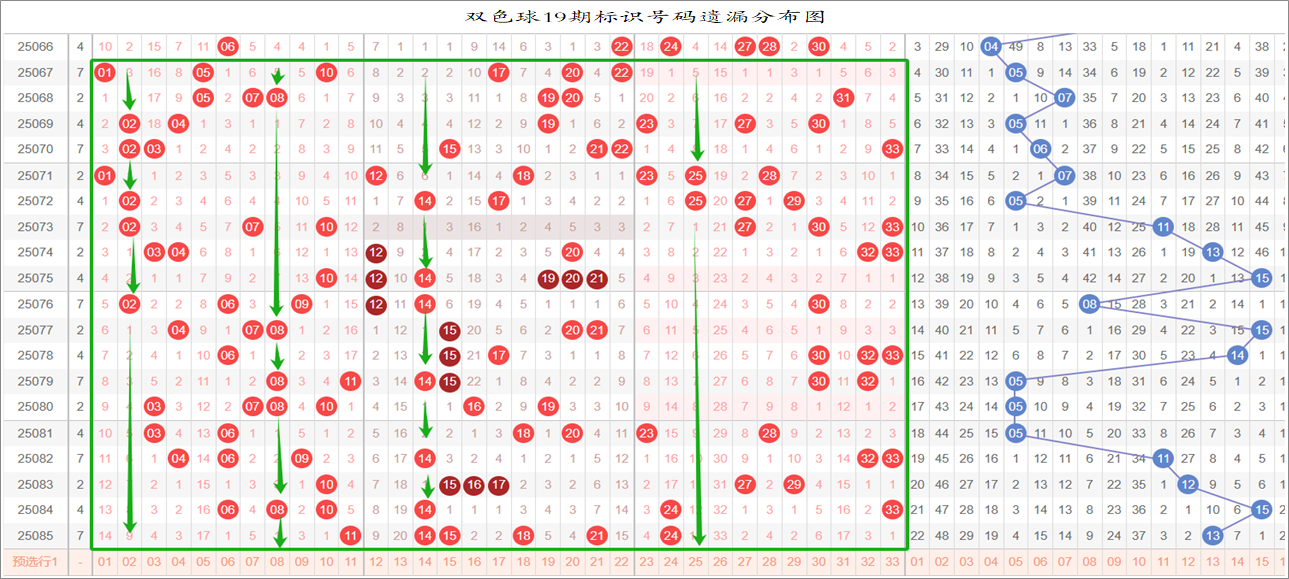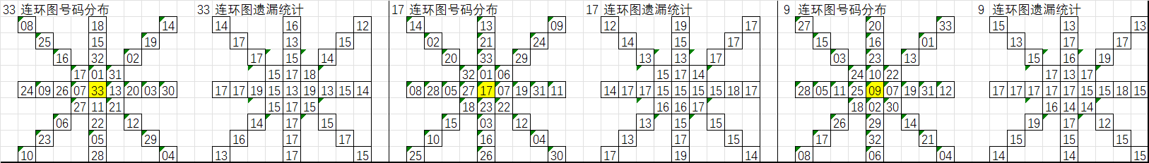 由于数据量大,不一一统计,下图为各个号码分别在33、17、9连环图上的遗漏统计汇总图: