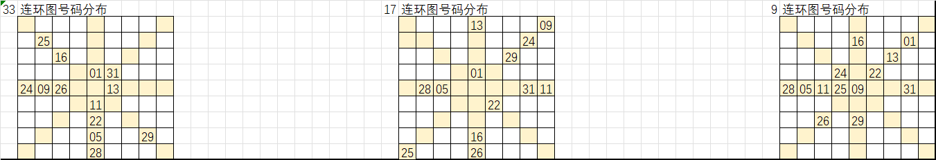 以上是遗漏大于16的号码分别在33、17、9连环图的分布,按照九转连环图选号规律,选取这些号码“环上”和“轴上”的相邻号码作为胆码,把这些胆码进行次数统计即可形成我们组号的排序,从出次多到少进行取号得出我们的大底。