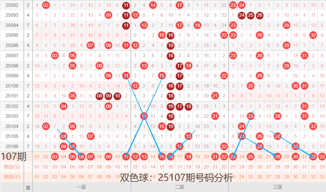 先介绍下上期开奖号码的基本情况,红球奇偶比:2:4,区间比:2:2:2,012路比:1:2:3,通过上期号码简单介绍,分享下25107期号码球个人认为的出号可能,供大家参考!