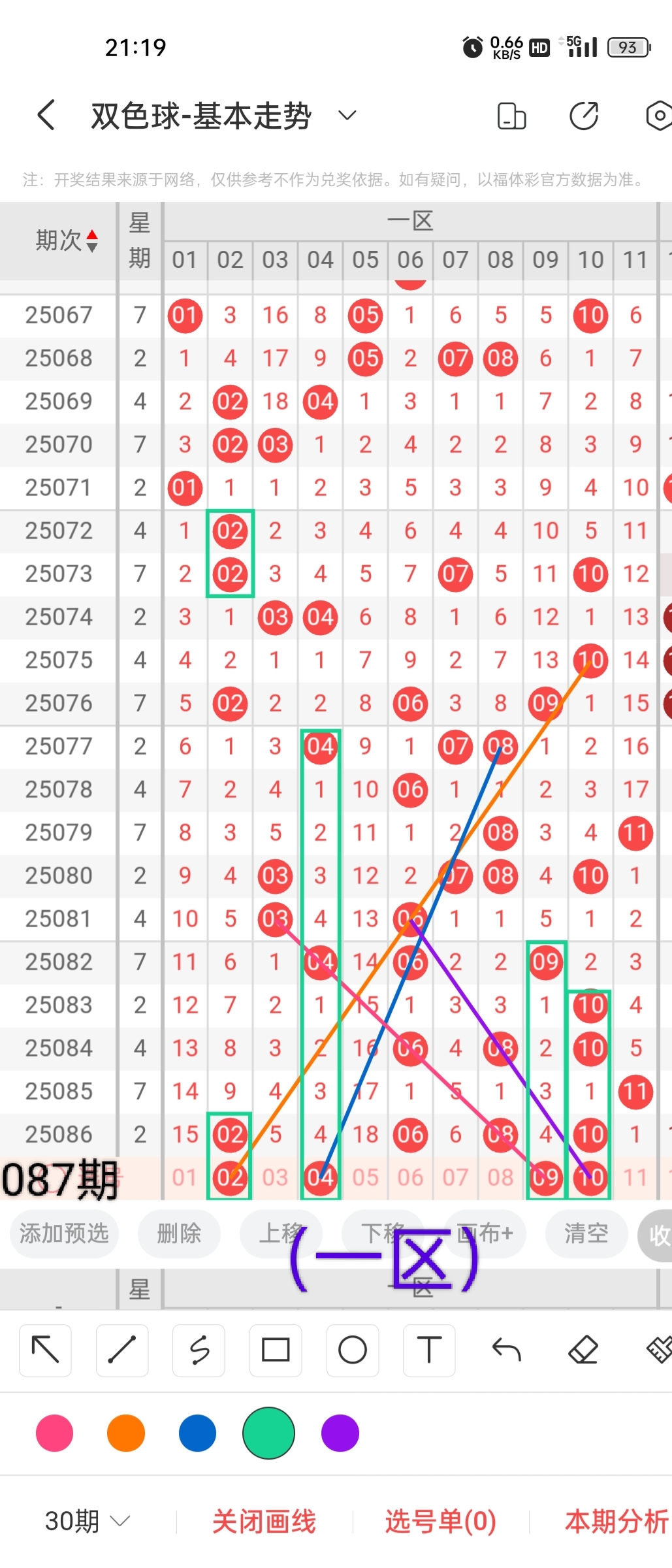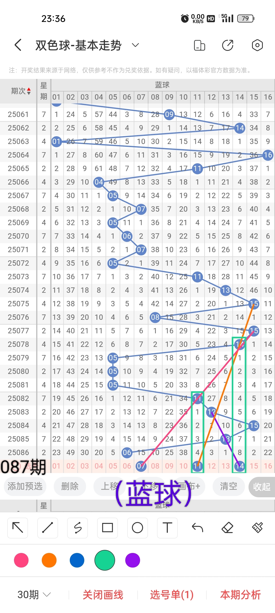 小梁根据图中画线思路,最后给大家汇总提供一下本期红球、蓝球数据,供大家参考: