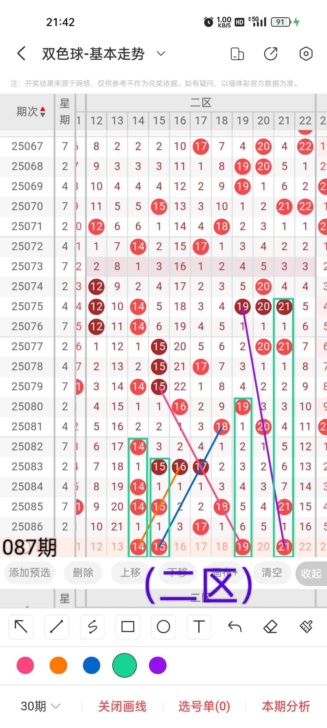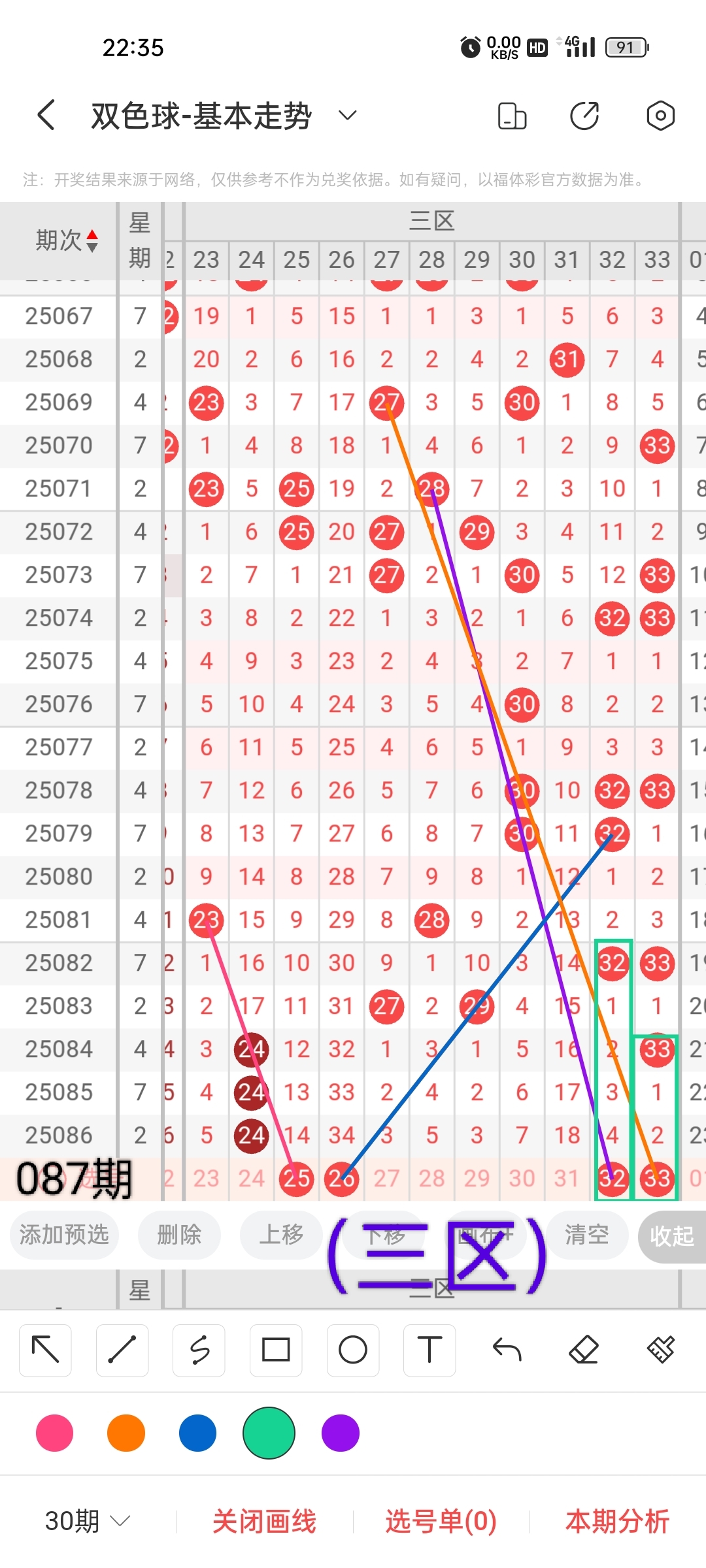 通过以上对上期的简单回顾,下面进入双色球第2025087期(下面简称本期)的选号分析: