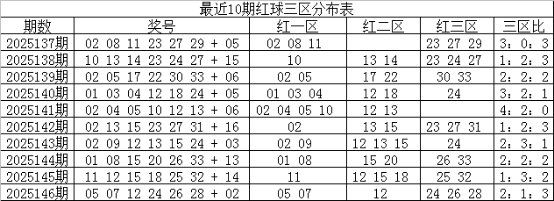 一区上期走温,出现2个奖号,近10期开出21个红球,走势与理论相当,本期预计再次走温,出现1-2个奖号,参考号码03;二区上期走温,开出1个红球,近10期共开出19个红球,出号比例与理论持平,本期看好走热,开出3个红球,注意号码20、21、22;三区上期表现较热,出现3个奖号,近10期共开出20个红球,出号与理论个数持平,本期预计继续走温,出现1-2个红球,看好号码23、29;