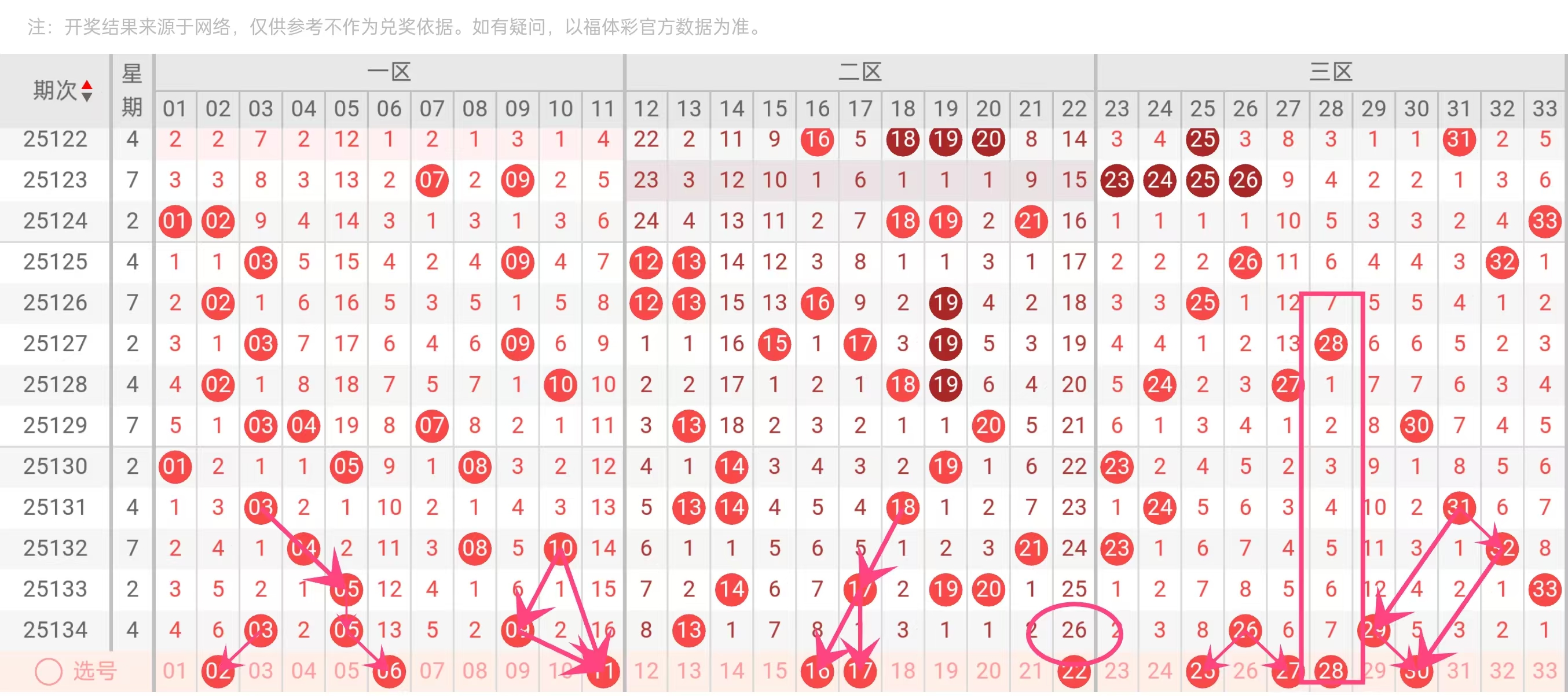 推荐10个红球:02、06、11、16、17、22、25、27、28、30