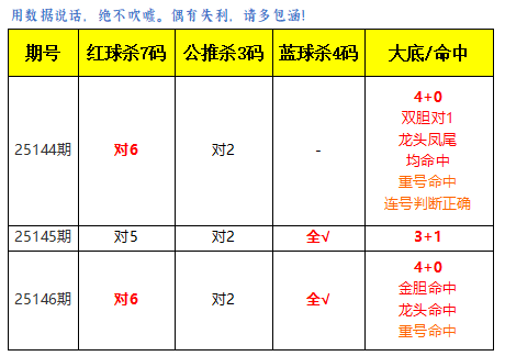 上期红球杀7码对6,公推杀3码对2。蓝球杀4码全对,红球命中2码,本期再接再厉!