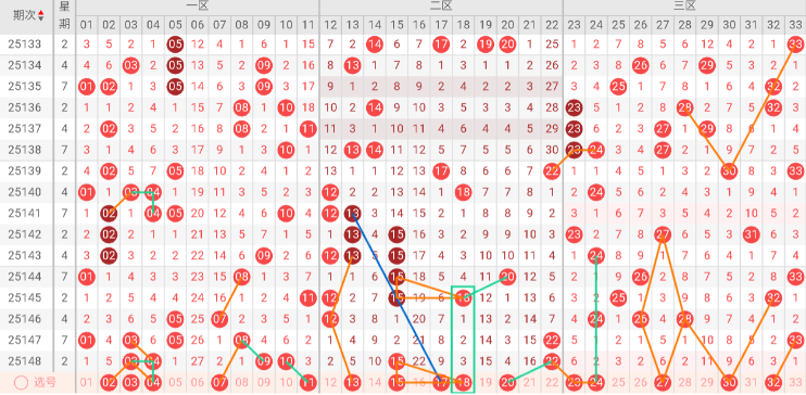 第三区间(23-33):三区上期没有开出号码,近5期出号量2-2-3-1-0。本期无三连号趋势,无隔码斜连趋势。近5期平均出1.6枚,平均出号减少。走势揭示退潮式枯竭。从稳定的2-3个,逐步下滑至上期的空开。且近三期呈明显的递减趋势,意味着大号区被极度压抑,积累了巨大的能量。根据历史数据,一个区间空开后,下一期强力回补是大概率事件。这种断崖式下跌后往往伴随着报复性反弹~,因此本期三区大概率将至少开出2-3枚号码,成为出号的重点区域。可重点关注~。建议关注号码:23、24、27、30、32。