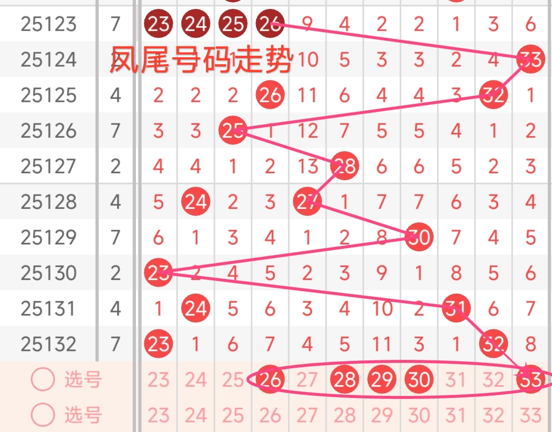 红球三区推荐(23~33): 上期开出2枚号码,号码为23、32,本期红三区建议出号1-3枚,本期红三区建议出关注号26、28、29、30、33。