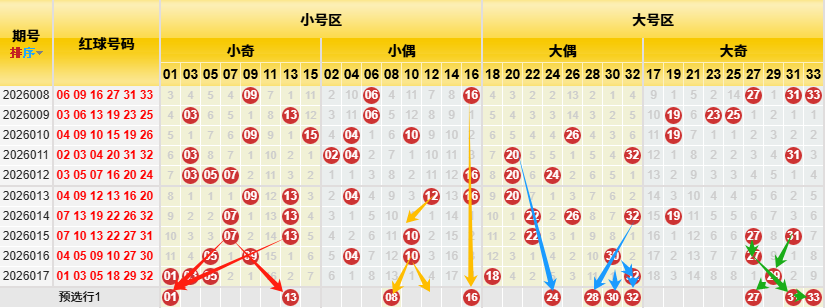 【数据参数】依前区大小奇偶属性,组合分成小号(0-16)大号(17-33)区,小号区分成小奇(1、3、5、7、9、11、13、15)和小偶(2、4、6、8、10、12、14、16),大号区分成大偶(18、20、22、24、26、28、30、32)和大奇(17、19、21、23、25、27、29、31、33)。