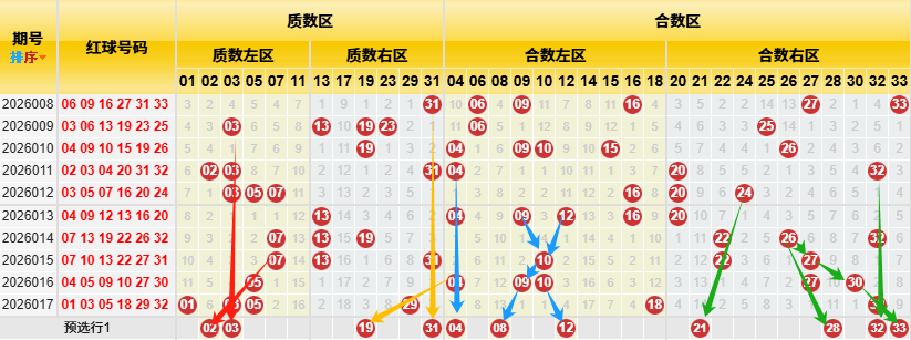 【数据参数】 根据前区质合小大属性,组合成上图质数区1、2、3、5、7、11、13、17、19、23、29、31和合数区4、6、8、9、10、12、14、15、16、18、20、21、22、24、25、26、27、28、30、32、33,质数区分为质数左区1、2、3、5、7、11和质数右区13、17、19、23、29、31;合数区分为合数左区4、6、8、9、10、12、14、15、16、18)和合数右区20、21、22、24、25、26、27、28、30、32、33。