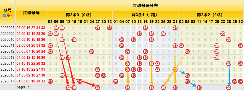 【数据参数】 根据前区除3余数,组合成上图分别为余0路(简称0路)3、6、9、12、15、18、21、24、27、30、33;余1路(简称1路)1、4、7、10、13、16、19、22、25、28、31; 余2路(简称2路)2、5、8、11、14、17、20、23、26、29、32。