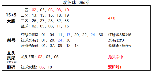上期红球杀8码对6,免费文章杀4码对3,蓝球杀5码全对,双胆对1,龙头命中,大底命中4+0,本期再接再厉!