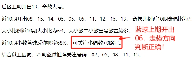 蓝球推荐关注小偶0路,虽然出号06不在推荐号码中,但确为小偶0路号,出号方向正确。