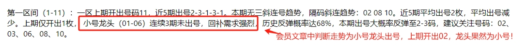 会员文章中一区提到龙头为小号,上期开出号码为02,果然是小号出龙头,判断正确!