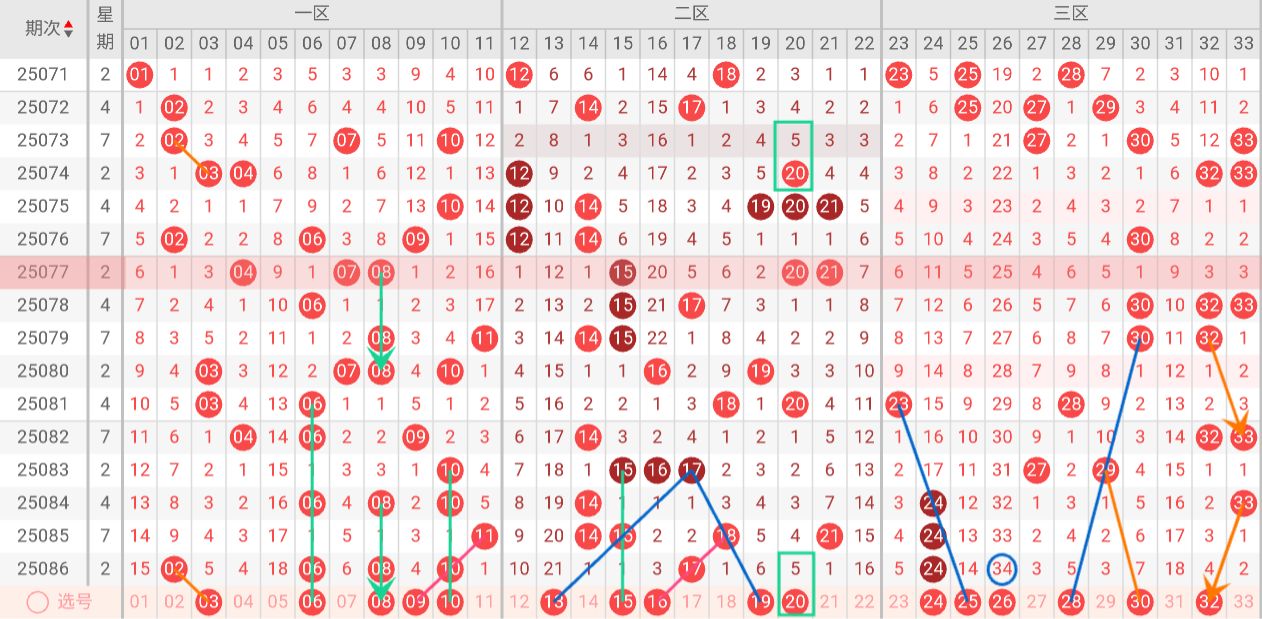 根据以上特点,我们对双色球第25087期进行如下分析: