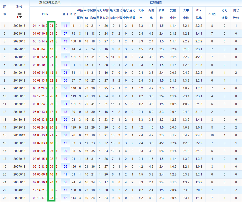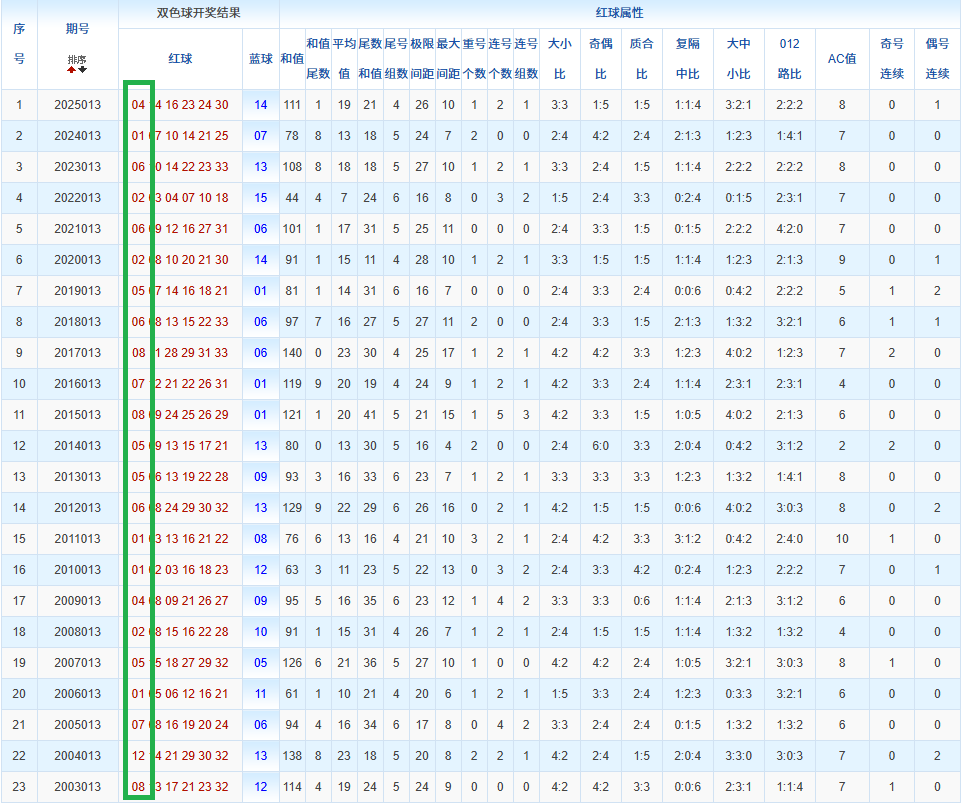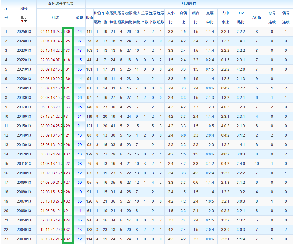 通过观察,我发现双色球往年同期的开奖数据与本期号码之间存在显著关联。具体来说,在红球中,从第一位至第六位,通常会有约4个位置上的数字与往年同期相同位置的号码一致;而蓝球号码中,也有多期开奖结果直接包含了往年同期的数字。因此,我们可以借助往年同期各位置上的号码,作为分析本期开奖情况的重要依据。在此基础上,还可结合往年同期的其他相关条件,进行综合性的号码组合推荐。