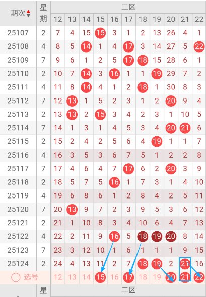 根据走势图可以看出当前区段,115期开出来19一个号码球,116期没有开出号码球,117期开出了17.20二个号码球,118期开出了16一个号码球,119期没有开出个号码球 ,120期开出13一个号码球 ,121期没有开出号码球 ,122期开出个16.18.19.20四个号码球 ,123期没有开出号码球 ,124期开出个18.19.21三号码球 ,按照如此规律本期当前区可能开出1单1双。我们看下当前区上期没有开出重叠号,那么本期当前区要定重叠号的情况下可关注21号码球。再看下当前区上期没有开出斜连号,当期选号得留意斜连17号码球。本区重点关注15.17.20.21.22