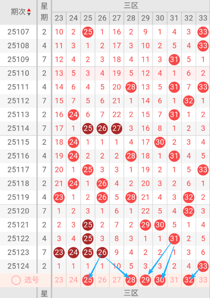 根据走势图可以看出当前区,115期开出来24.30二个号码球,116期开出来24.28.30三个号码球,117期开出了25.33二个号码球,118期开出了24.26二个号码球,119期开出23.26.28.32四个号码球 ,120期开出32一个号码球 ,121期开出25.29.30三个号码球 ,122期开出个25.31二号码球 ,123期开出23.24.25.26四个号码球 ,124期开出33一个号码球 ,按照如此规律判断本期当前区可能开出1双。我们看下当前区上期没有开出重叠号,那么本期当前区要定重叠号的情况下可关注33码球。再看下当前区上期没有开出斜连号,当期选号得留意32斜连号。本区重点关注25.28.29.30.32